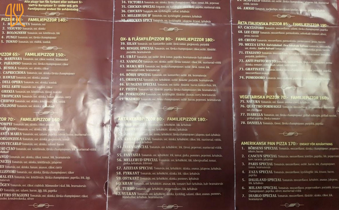 ★ 3.3 / 5 (550 recensioner)Pizzeria Pizza Kaffe Kött SalladMelleruds Pizzeria Gatukök